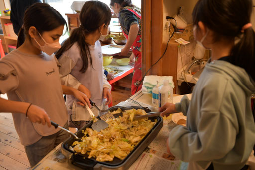 01日 4月 2023 3月23日焼きそば作り! 学校が給食無しで早帰りのこの日は、 焼きそば作りを行いました。 買物に行く係、野菜を切る係、炒める係、お皿等準備する係、と役割分担を行い、皆で協力しました! 人数よりちょっと多めに焼きそばを買ったけど、みんなで完食!! 何杯もお代わりする子もいました。 自分達で作るとより一層美味しいね ♪ これを機に、お母さんのごはんづくりのお手伝いもしてみてね。 tagPlaceholderカテゴリ: